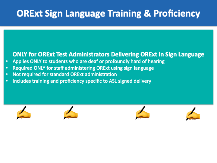 The Sign Language Training prepares interpreters to provide access to the Oregon Extended Assessments, where permitted by ODE's accommodations guidance. The training consists of three sections, designed to address interpretation concerns across all content areas and grade levels: English Language Arts, Mathematics, and Science, on the Oregon Extended Assessment. PowerPoint handouts for the trainings are available in the Course Materials section of the Sign Language Training tab.