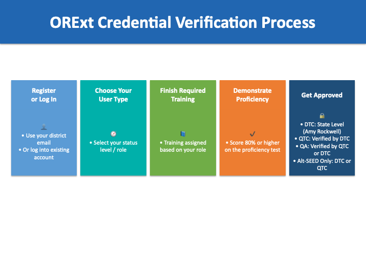 User status is always reset to Account-In-Training (AIT) at the beginning of the year. Training and Proficiencies must be completed, and credentials verified to gain DTC, QTC, QA, or Alt-SEED Only access. All users administering the ORExt must be licensed staff.